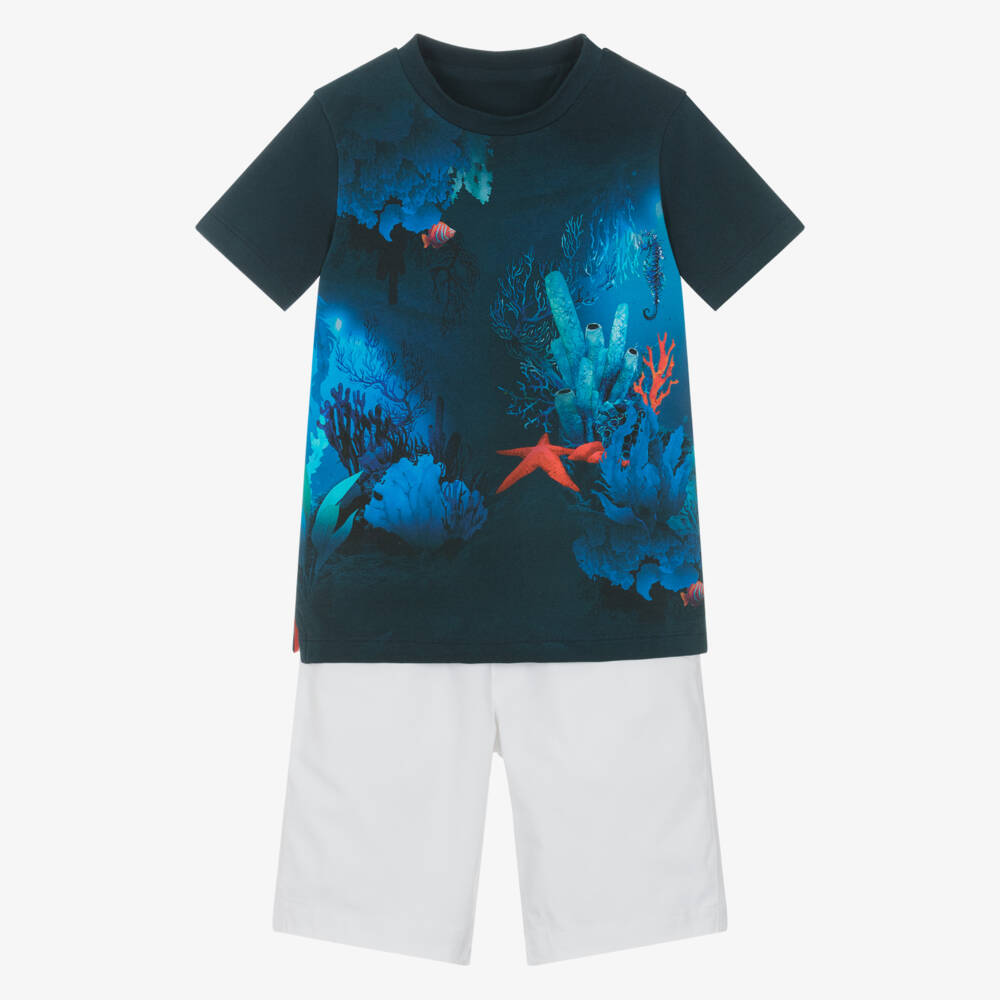 Boys blue and white cotton shorts set by Lapin House. The soft, comfortable jersey T-shirt has a striking sea life-inspired print with fish and coral. The coordinating white twill shorts have an elasticated waistband with useful belt loops and pockets on the front and back. This practical set is ideal for outdoor play or casual outings.