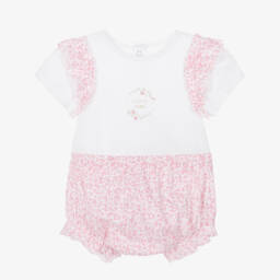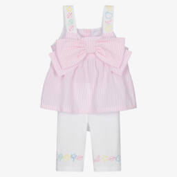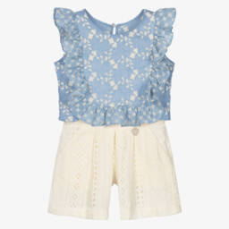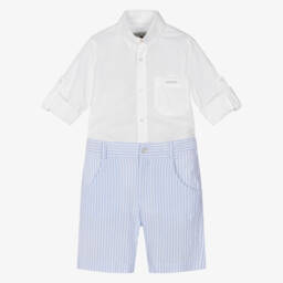Boys smart-casual shorts set by Lapin House, in white and navy blue. The crisp white shirt has a textured, knitted collar and matching trims on the cuffs, with the button-down placket lined in blue and white stripes. It is paired with navy blue twill shorts, that have belt loops, pockets on both the front and back, and a useful adjustable waistband.