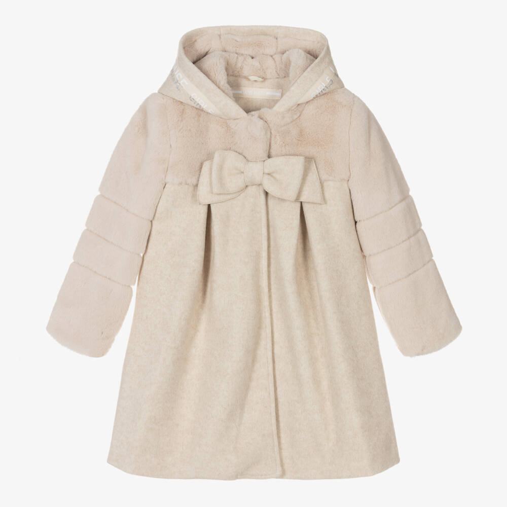 Gorgeous beige coat for girls by Lapin House, made in mid-weight, beautifully soft, wool-effect Tactel. It has a super soft faux fur bodice, sleeves and hood lining, with a glittery silver and white logo trim on the hood. It has a fixed bow on the front, concealed front popper fastenings, useful concealed side pockets and a cotton lining for comfort.