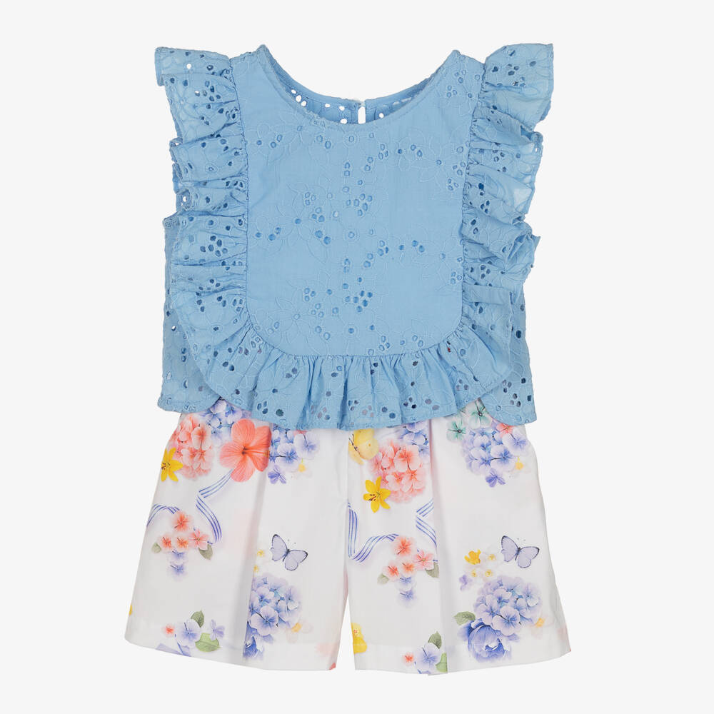 A lovely blue and white shorts set for girls by Lapin House, made in soft and breathable cotton. The sleeveless broderie anglaise top has beautiful ruffle trim on the front and back and fastens with a stylish keyhole button. It pairs with white shorts that are beautifully patterned with hydrangeas, butterflies and ribbons in pink and blue. Comfortable and easy to wear, they have an elasticated waistband, with pleats for a flared shape and useful front pockets.