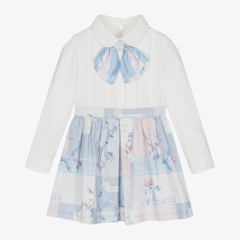 Girls smart cotton blend dress by Lapin House, with the look of a two piece. The white twill top part has a silky blue, pink and white logo bow sewn on the neckline, pintucks on the front and puffed sleeves with twinkling diamanté button fastenings on the cuffs. The pleated blue and pink skirt has a pretty patchwork print, with a concealed zip and diamanté button fastening on the back.
