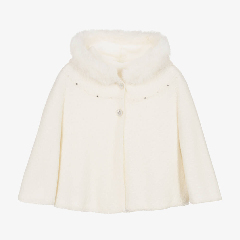 Lovely ivory hooded cape for girls by Lapin House, knitted in a soft, lightweight angora and wool blend, with sparkly silver threads. Ideal for a special occasion, it has pretty crystals and pearls on the front. The hood is trimmed with soft faux fur and the cape is fully lined in cosy velour for added warmth. It fastens on the front with diamanté-trimmed buttons for a pretty finishing touch.