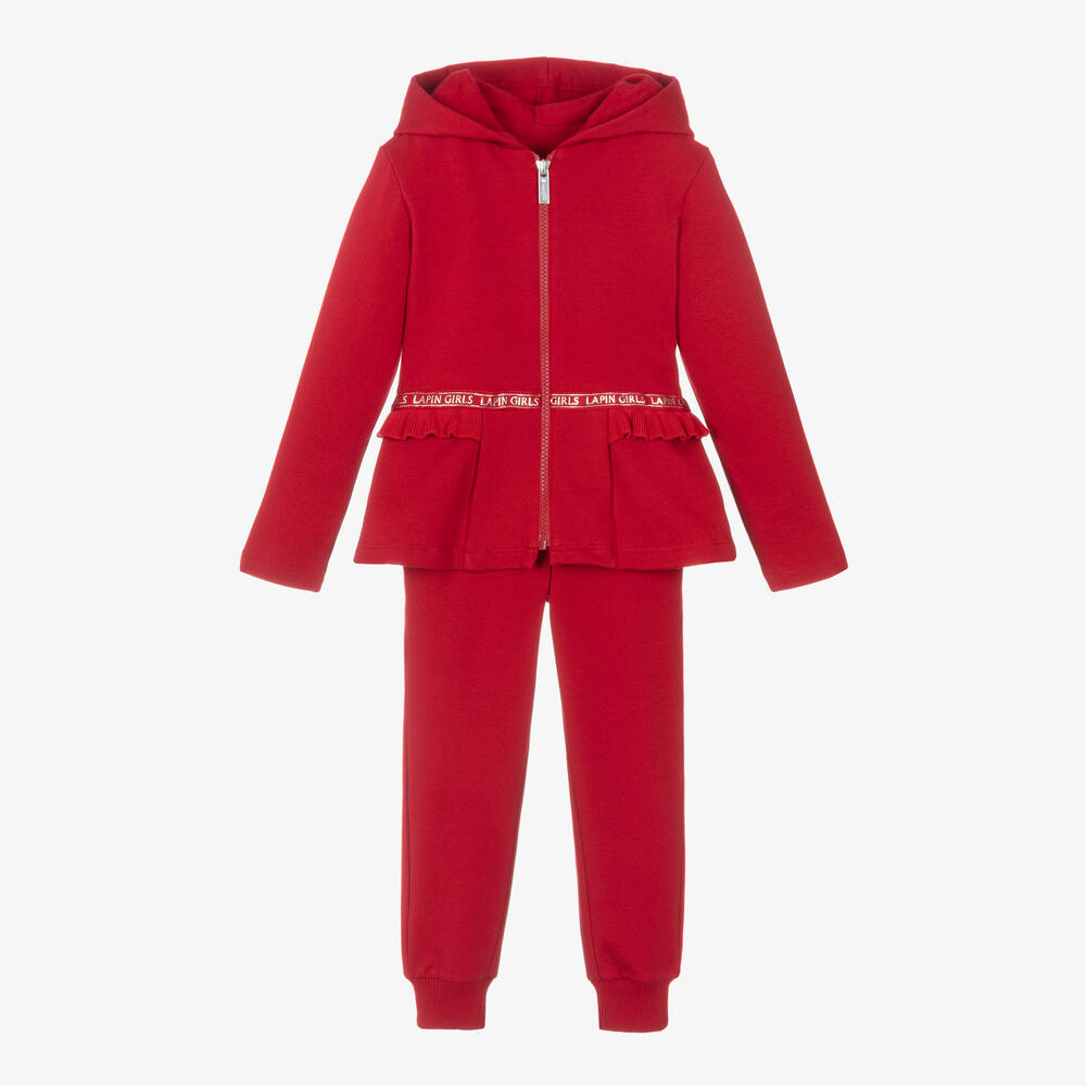 Casual yet stylish, this red tracksuit for girls is by Lapin House. Cosy and comfortable, it is made in soft cotton jersey, with a warm fleecy inside. The hooded top is trimmed with a ribbed ruffle around the waist and has silver-lettered logo tape across the front. Designed with a pretty flared hem, it has a front zip fastening with a branded metal puller. The joggers have ribbed ankle cuffs, an elasticated waist for an ideal fit, and slanted pockets at the hips.