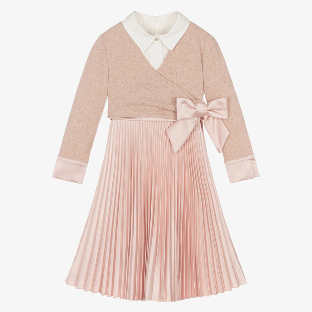 Smart white and pink dress set for girls by Lapin House, styled with a white twill shirt bodice and pleated satin skirt. Lined with cotton for comfort, the capped-sleeve dress has a diamanté faux button on the neckline, a hidden zip on the back, and a removable satin sash on the waist, fastening with concealed poppers. In glittery pink, the wrap-around cardigan is made in a soft cotton-blend knit, with a satin bow appliquéd on one side, silky cuffs, and button and popper fastenings.