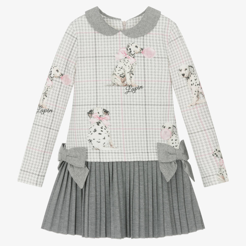 A grey and white dress for girls by Lapin House, made in mid-weight cotton-rich jersey. Soft, comfortable and beautifully patterned, the long-sleeved bodice is decorated with a charming houndstooth print and sweet dalmatian puppies wearing pink bows. The grey rounded collar and decorative bows are designed with silver glitter accents for a touch of sparkle. Falling from the dropped waist is a grey pleated skirt to complement the colour palette. This lovely dress fastens with a neatly hidden zip on the back.