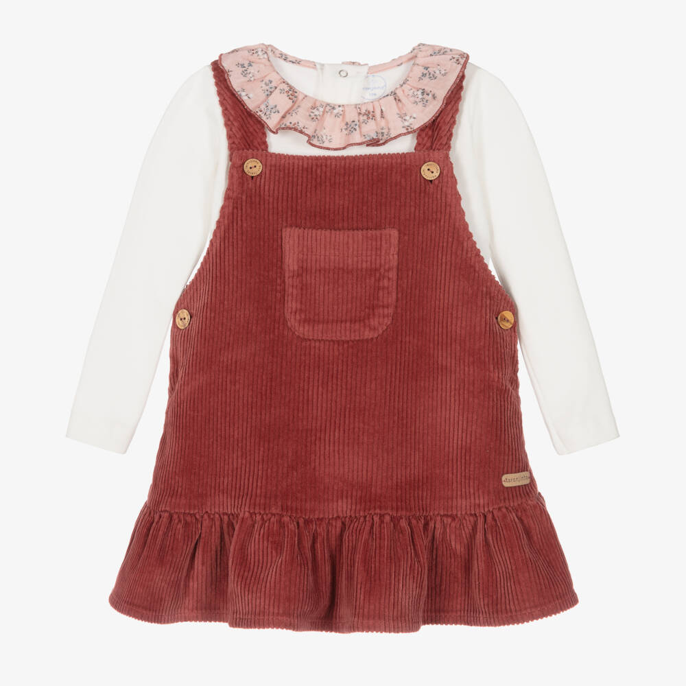 Lovely for baby girls, a delightful white bodysuit and pink pinafore dress set by classically-styled brand Laranjinha. Made in soft cotton jersey, the bodysuit has a pretty pink floral ruffle collar, with popper fastenings on the back and between the legs. The dress is made in comfortable corduroy, with a patch pocket on the front. There are adjustable, branded wooden button fastenings on the shoulder straps and matching fastenings on the sides.