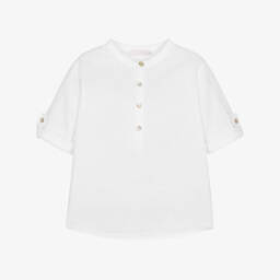 White cotton T-shirt for boys by Laranjinha, made in soft and comfortable cotton jersey. A classic style, it has exposed blue stitching on the cuffs and hem, and a blue surf-themed print on the front.