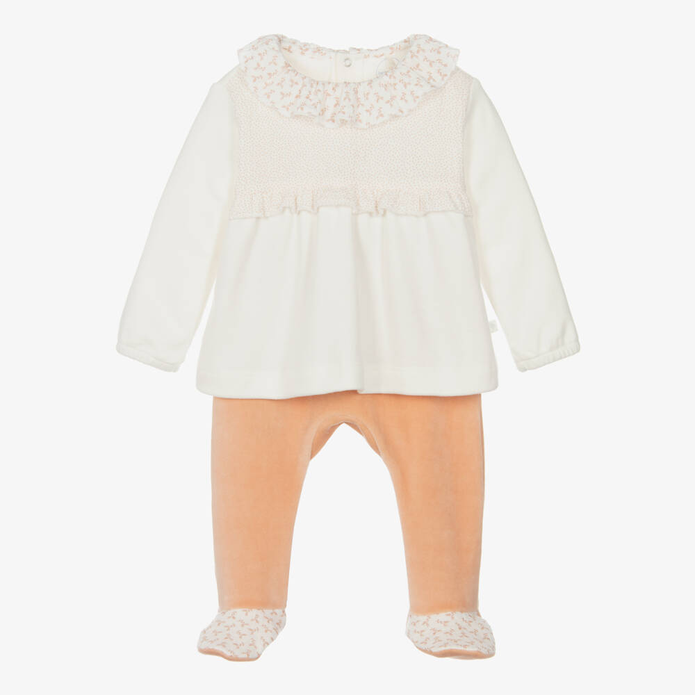 Adorable ivory and dusky pink two-piece babygrow for girls from Portuguese brand, Laranjinha. The pretty top is made in soft cotton jersey, with a spotty chest panel and a floral print ruffle collar. The long sleeves have gently elasticated cuffs and it fastens with poppers on the back. The velour bottoms have a comfortable elasticated waist and matching floral trim on the feet.