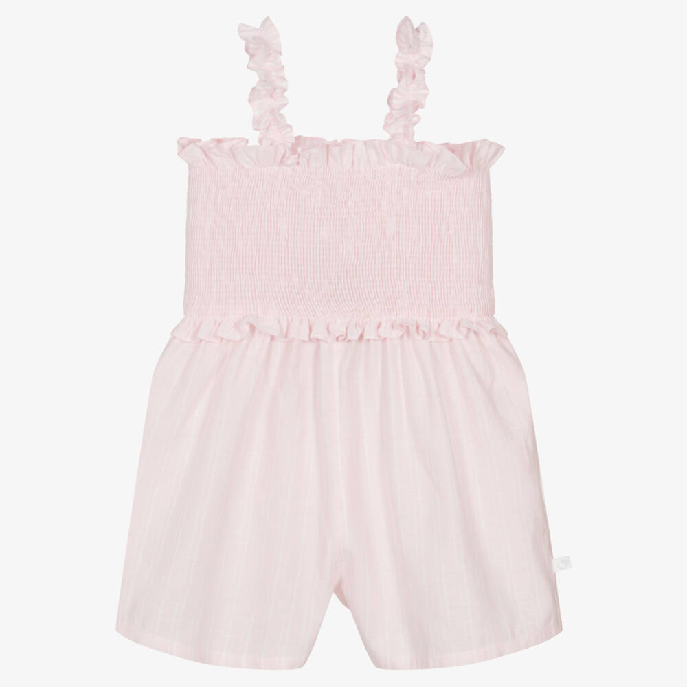Pretty pink playsuit for girls by Portuguese brand Laranjinha, made in a lightweight cotton and linen blend. The material has white stripes for a traditional look and the bodice is shirred for a comfortable fit. For a feminine finish, it has ruffle details on the top.