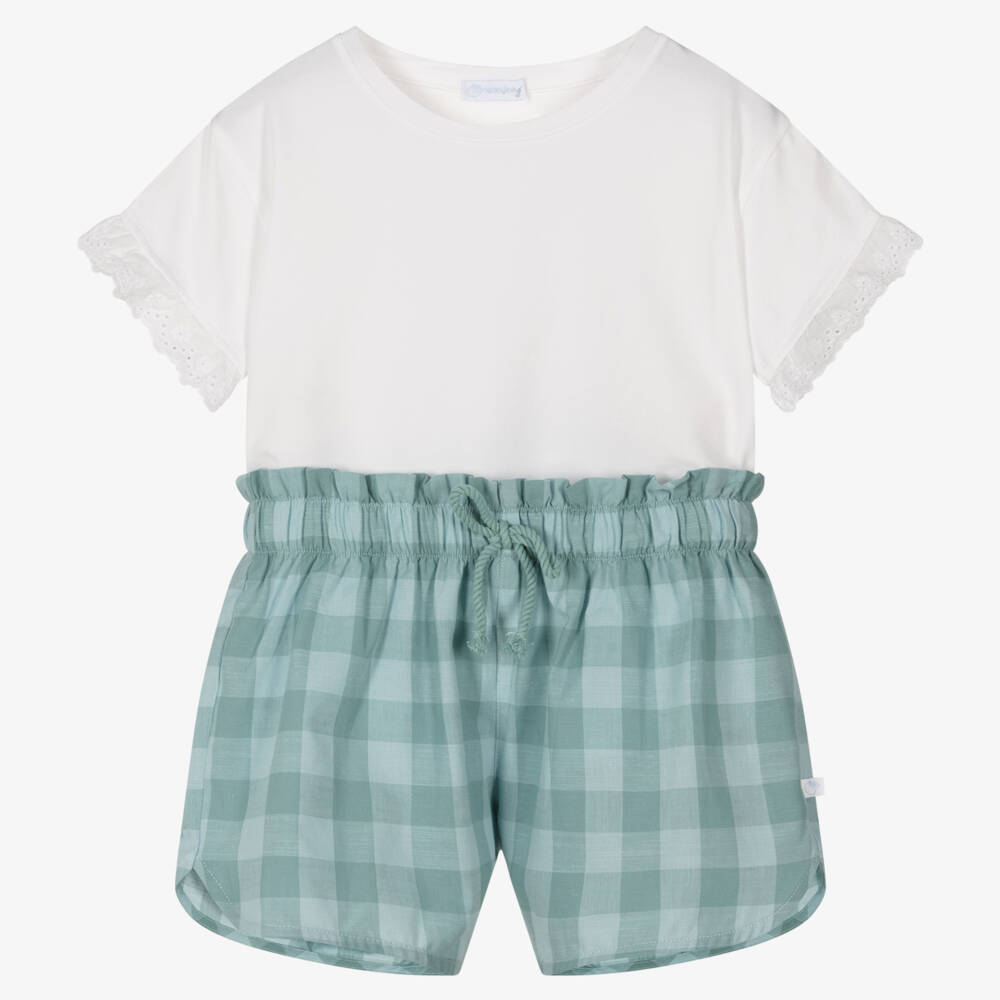 Lovely and casual, this white T-shirt and blue gingham check cotton shorts set is by Laranjinha. The jersey top has a dropped shoulder look with sweet broderie anglaise trims on the little sleeves. Woven in a lightweight, green-blue gingham check pattern, the shorts have an elasticated, paper bag style waist decorated with a fixed bow.