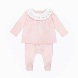 In a traditional style, this pale pink knitted babygrow for girls is by Laranjinha. Made in a luxuriously soft wool and cashmere blend, it has an ivory Fair Isle pattern across the chest for a classic look. The coordinating trousers have a gently ribbed waist and enclosed feet for extra cosiness.