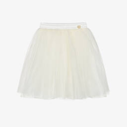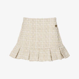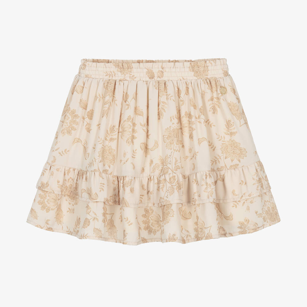 Pretty beige skirt for girls by Le Chic, with a tonal floral print. It is made in soft, crêpe chiffon, with a lovely ruffled hem and a gold heart logo charm on the hip. For comfortable wear, it has a lightweight cotton lining and a stretchy, elasticated waistband.