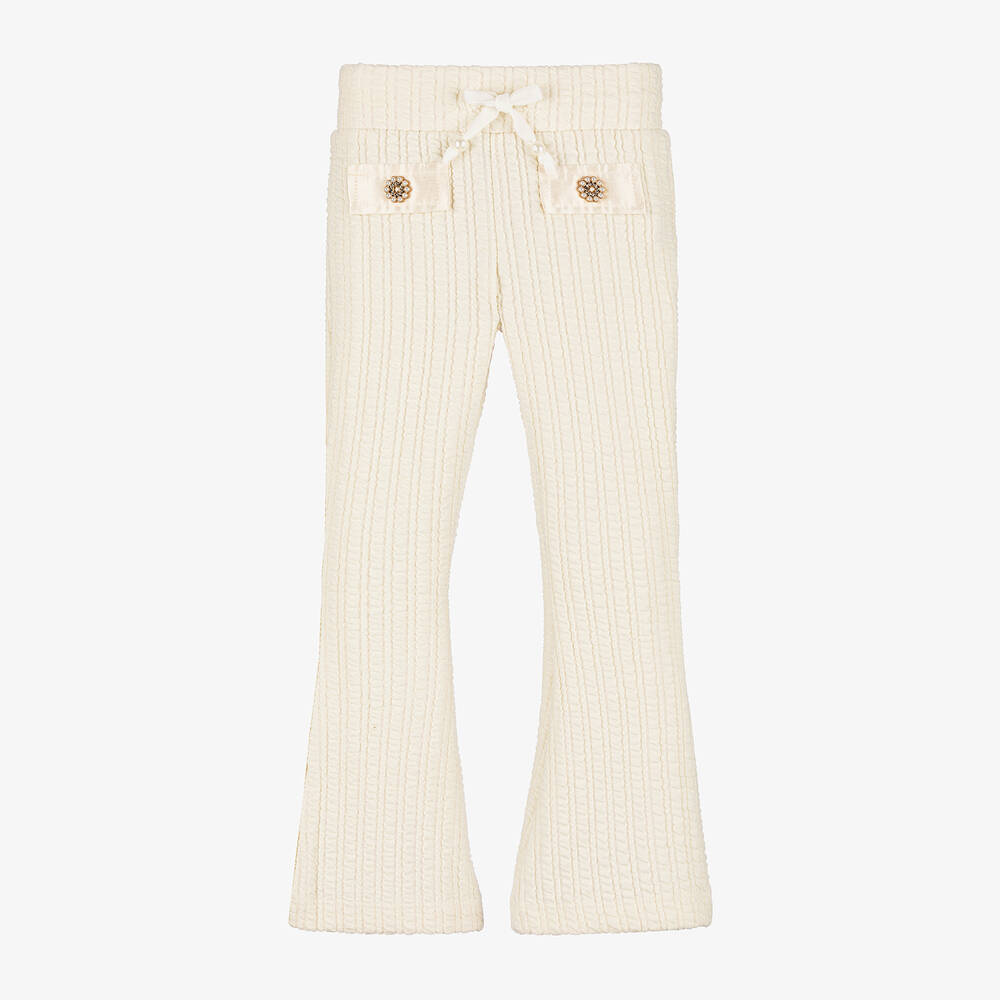 Combining style and comfort, these ivory trousers for girls are made in ribbed, seersucker jersey. Beautifully soft and stretchy, they have a flared leg and the faux pockets have satin flaps with pearl and diamanté decorations. For an adjustable fit, the waistband has a drawstring ribbon tie.