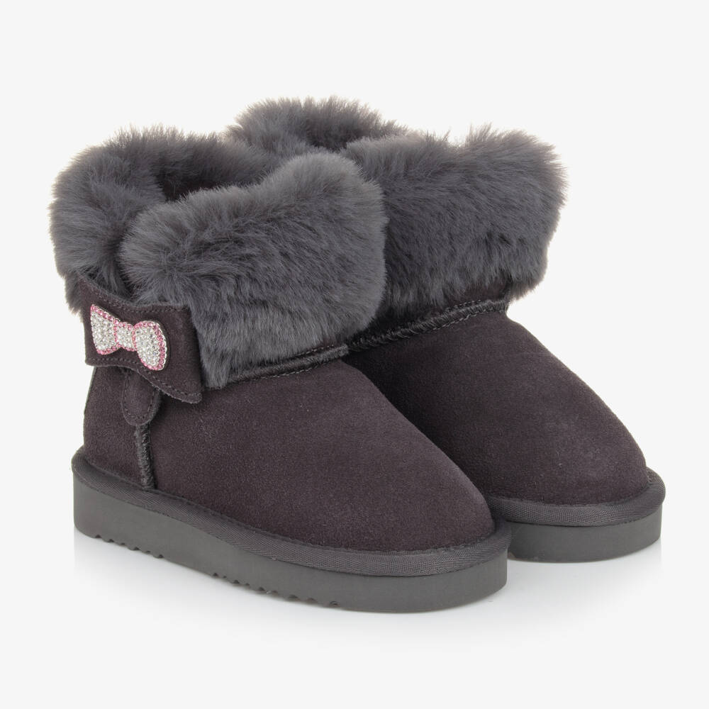 Made from smooth suede leather, these grey boots for girls are by Lelli Kelly. Ideal for the cooler weather, they have super soft faux fur cuffs and lining. There is a pretty bow detail on the side with a pink and silver diamanté embellishment for an added touch of sparkle. Easy to pull on, they have a non-slip rubber outsole and a pale blue logo patch on the heel.