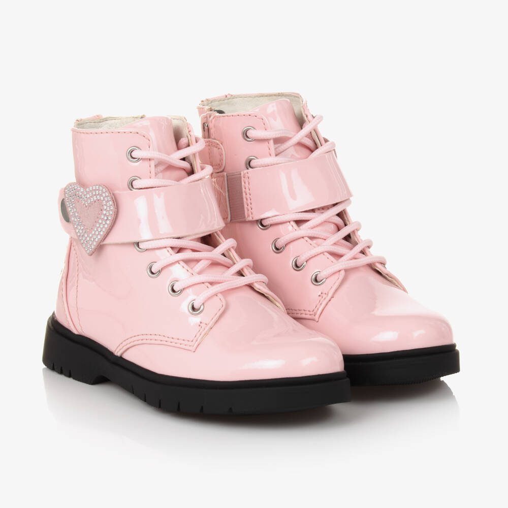 Pale pink lace-up boots for girls by Lelli Kelly, made from shiny faux patent leather. Fastening with a popper, the front strap is embellished with a pretty diamanté heart for an added touch of sparkle. Lined in mesh textile with a soft leather insole, these boots have practical zip and velcro fastenings on the side and non-slip rubber outsoles for good grip. There is a tonal embroidered logo on the heel for a subtle branded finish.
