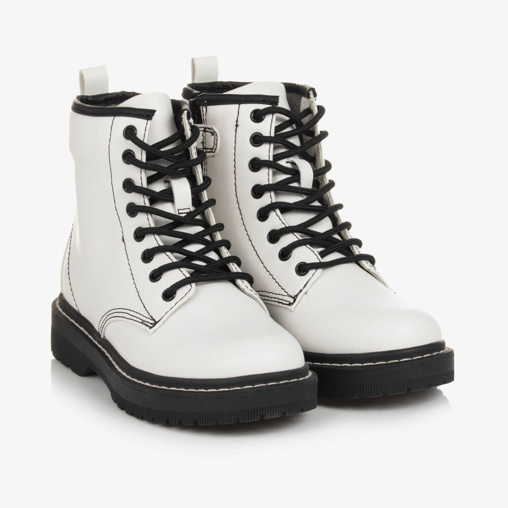 White faux leather boots for girls by Lelli Kelly, with contrasting black laces and topstitching. Lined in grey mesh textile with a soft leather insole, these boots have practical zip and velcro tab fastenings on the side to make dressing easier. They have a non-slip rubber outsole for good grip and an embroidered logo on the heel.