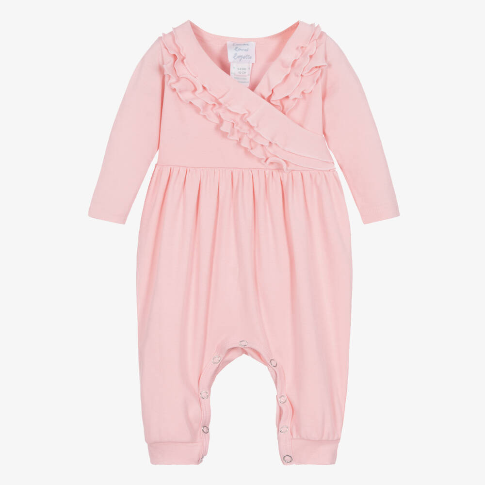 Pale pink romper for baby girls by Lemon Loves Layette, made in soft and lightweight Pima cotton jersey. Designed with a pretty ruffle on the cross-over bodice, it has long sleeves and popper fastenings between the legs for quick and easy dressing.