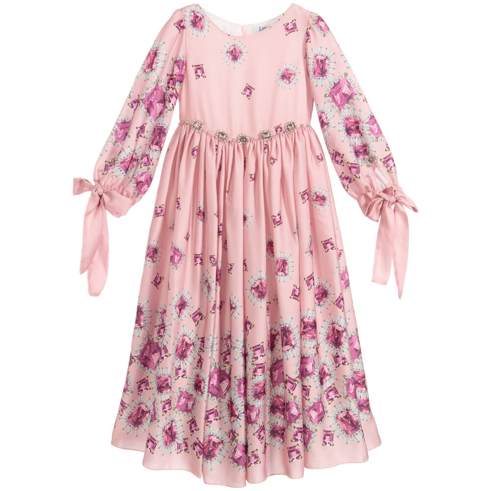 Girls luxury pink satin long dress by Lesy. The lightweight silky fabric has a lovely jewel print, with sparkly jewel appliqué at the waist and on the cuffs. The wrists have ribbon ties and the skirt is gathered and gently pleated, with a satin lining and tulle petticoat creating fullness.