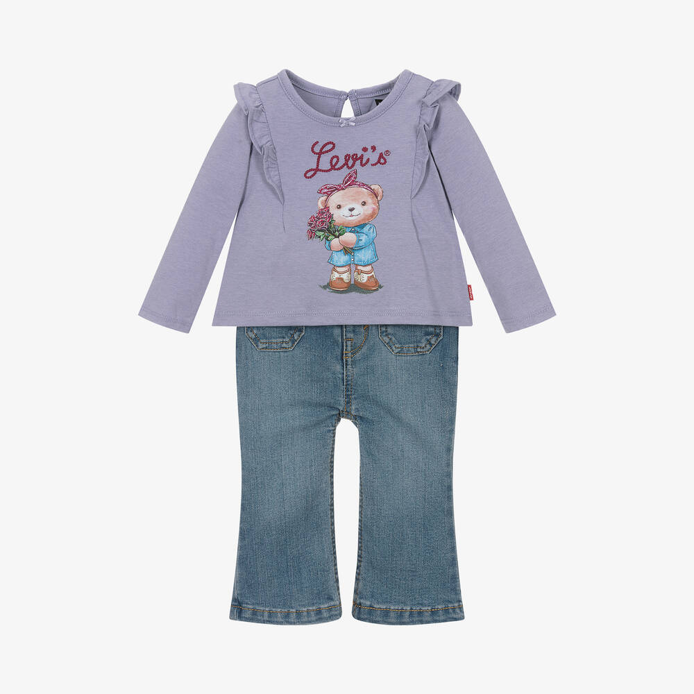 Comfortable blue denim jeans set for little girls by Levi's. The lilac purple top has a sweet teddy bear printed on the front, with an embroidered red logo. Made in soft, stretchy jersey, it has pretty ruffles over the shoulders. The washed and worn look jeans have an adjustable waist for a great fit. Both pieces have the brand's iconic red logo tab.