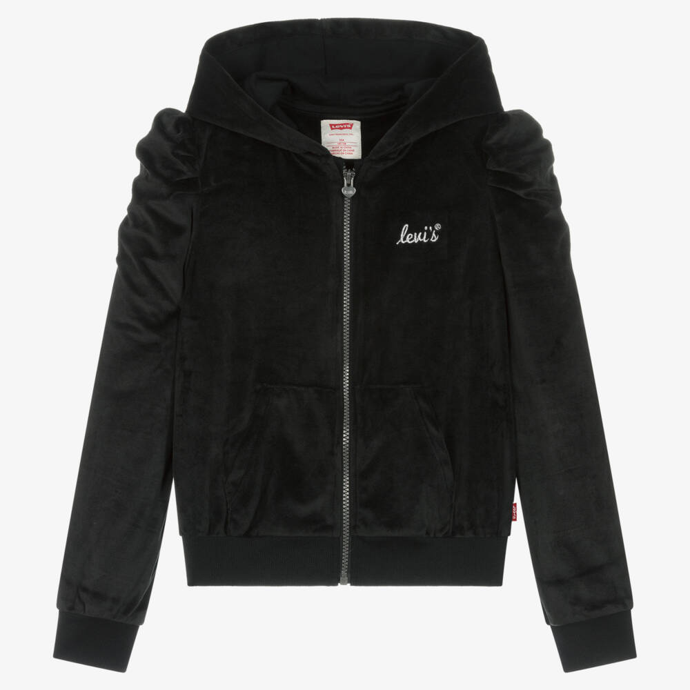 Black hooded zip-up top for teen girls by Levi's, with a sparkly silver embroidered logo on the chest. Ideal for layering, it has front pockets and puffed sleeves for a pretty feminine look. Made in super soft velour, it has cosy ribbed trims and fastens with a zip on the front with a heart-shaped branded pull. The brand's signature Red Tab logo is on the side for a distinctive designer finish.