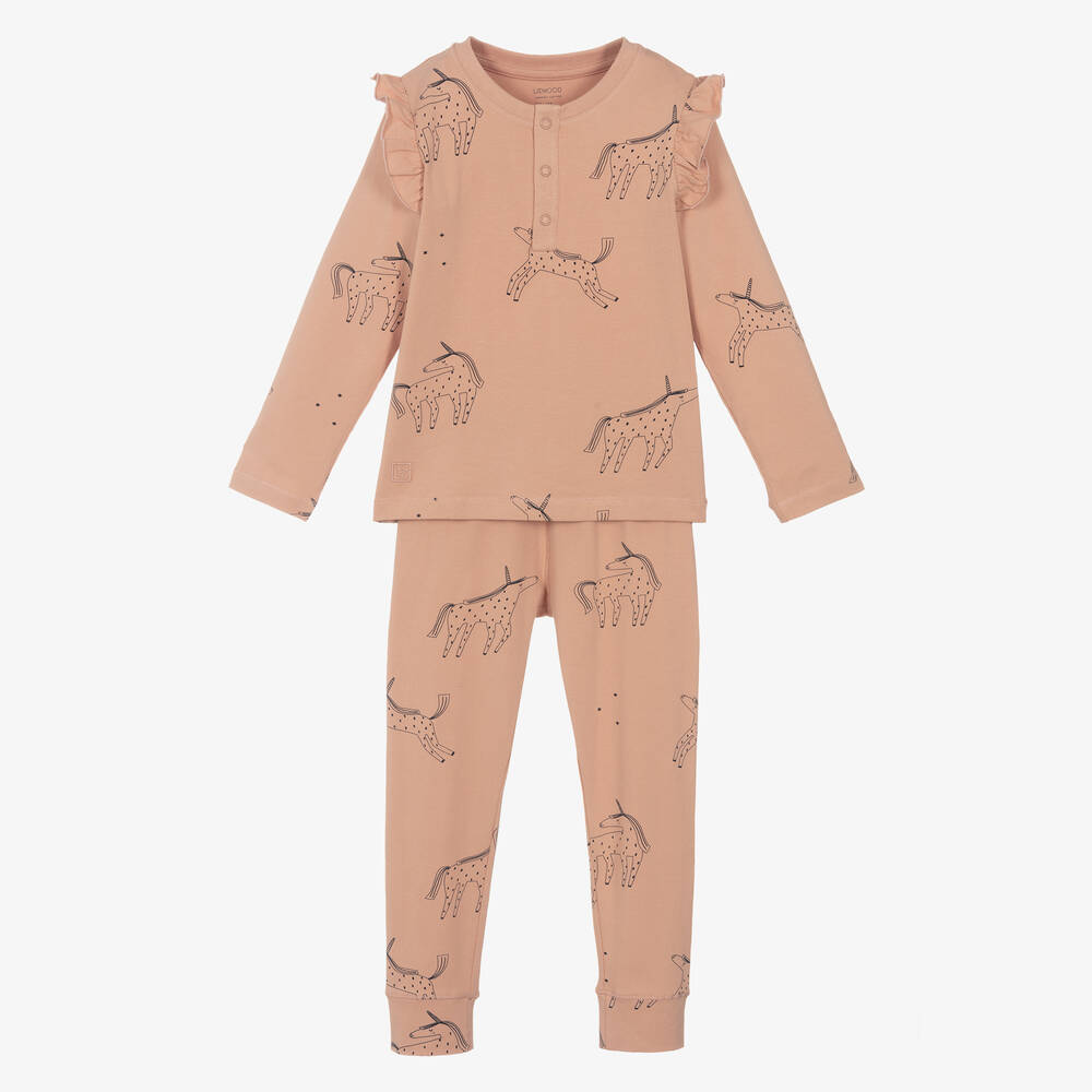 Pastel pink pyjamas for girls by Liewood, made in soft organic cotton jersey with a cute unicorn print. The long-sleeved top fastens with poppers on the front and has ruffles on the shoulders. The slim-fit bottoms have a comfortable, stretchy waist, ideal for a good night's sleep. These fun pyjamas come with a matching drawstring storage bag.
