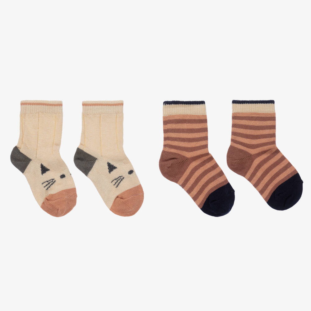 A two pack of cotton socks for boys and girls by Liewood. One pair is light beige with a cute cat face on the toe and pink trims. The other pair is a dusty pink with lighter pink stripes and navy blue trims.