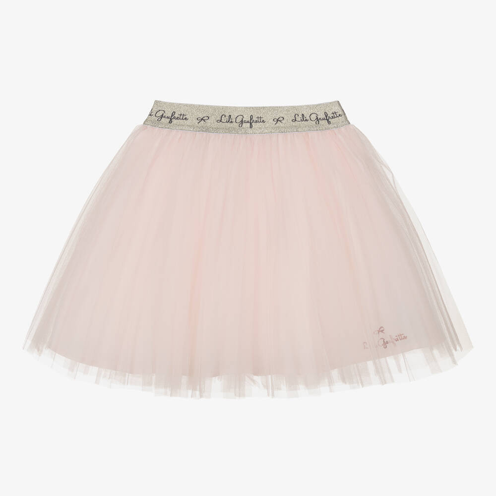 Pretty pink skirt for girls by Lili Gaufrette, made in soft pleated tulle. It has a soft cotton lining for comfort and modesty, embroidered with a rose gold logo by the hem. It has a glittery silver elasticated waistband with black jacquard logos.