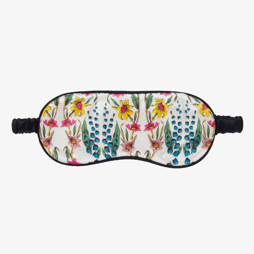 Mini-me ivory eye mask for girls by LiTTLE YOLKE, made in soft, lightweight silk, with a colourful wildflower print. Lightly padded, it has an elasticated strap and comes in a matching silk drawstring bag. Matching pyjamas are available.