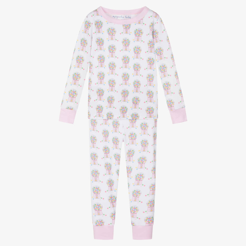 Girls white pyjamas by Magnolia Baby, made from soft Pima cotton jersey. Super fun, they have a delightful gumball pattern with pale pink cuffs and trims. Lightweight and stretchy, the bottoms have an elasticated waist to ensure a comfortable fit.