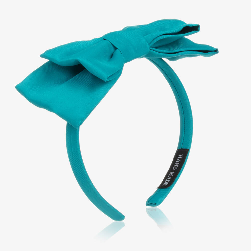 Lovely turquoise blue hairband for girls by Mama Luma. The fabric covered band is flexible, sitting comfortably on the head. Hand made, it has a large satin bow on the top, adding fun to any outfit.