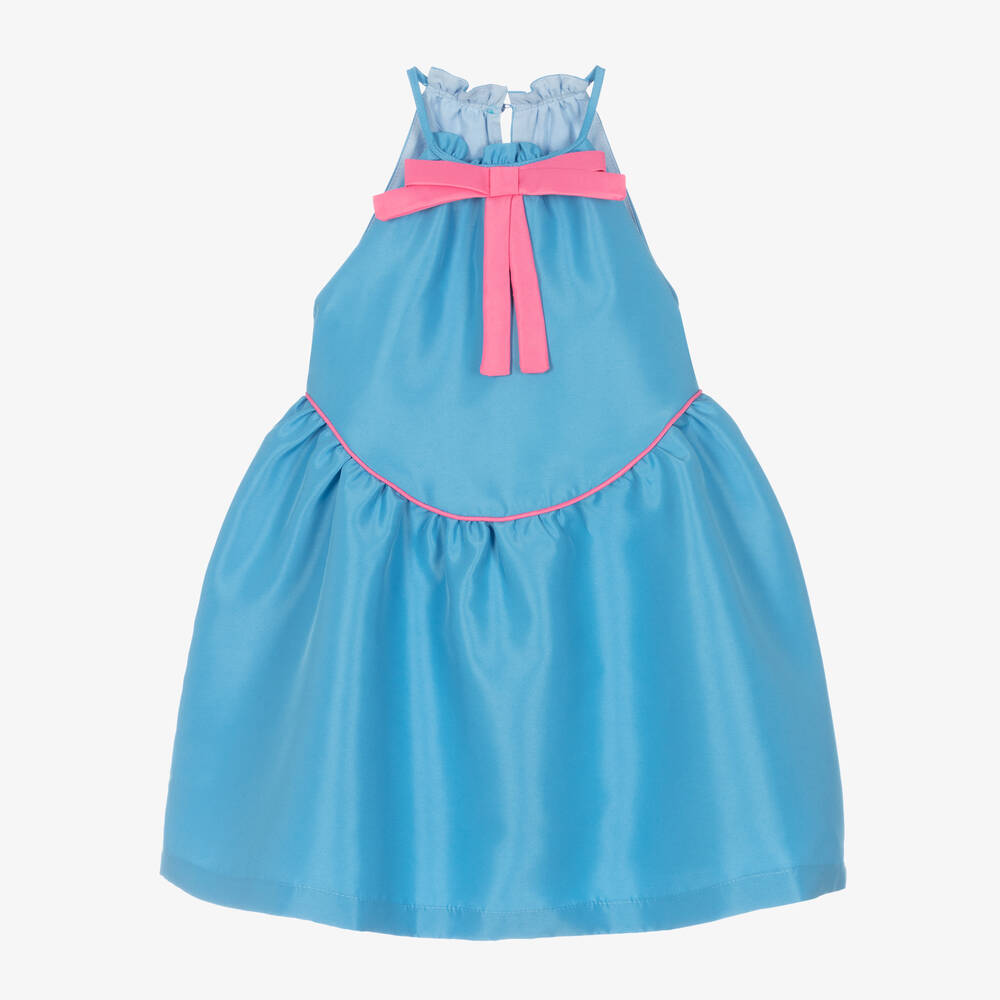Sky blue sleeveless dress for girls by Mama Luma, made in soft satin twill. Stylish and elegant, it has thin shoulder straps and a ruffle collar, with a large pink bow on the front. There is a matching pink piping trim where the bodice attaches to the full skirt. Fully lined for comfort, this lovely handmade dress fastens on the back with a button and concealed zip.