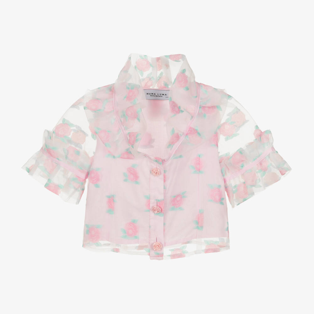 Ideal for a special occasion, this lovely pink blouse for girls by Mama Luma, is handmade in rose-patterned sheer organza. Both the neckline and sheer puffed short sleeves are defined by gorgeous frills, with rose-shaped button fastenings adding an elegant finishing touch. For ultimate comfort, it is lined in lightweight pink voile.