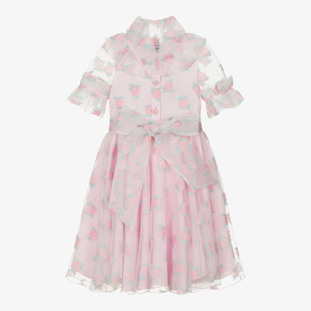 A stunning pink dress for girls by Mama Luma, handmade in rose-patterned sheer organza. This stylish design has a frill on the collar creating a high neckline, with a further frill on the puffed, sheer sleeves. It fastens with rose-shaped buttons on the front and has a sash on the waist that ties into a pretty bow. Fully lined in pink voile, it has a beautiful flared skirt giving this special occasion dress an elegant finish.