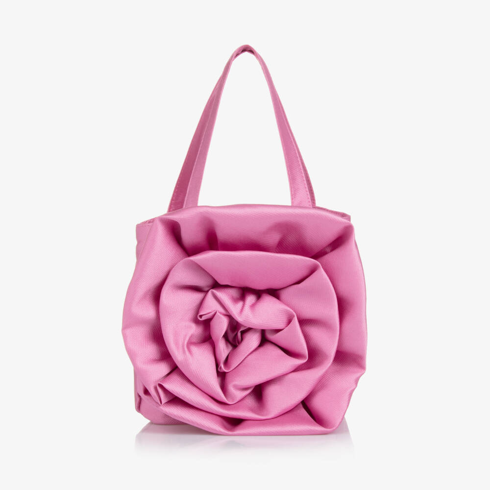 Gorgeous pink satin handbag for girls by American brand Mama Luma, with an eye-catching, oversized floral appliqué on the front. Made in lustrous twill, it has a small, single, fully lined compartment, just right for essentials when out and about.