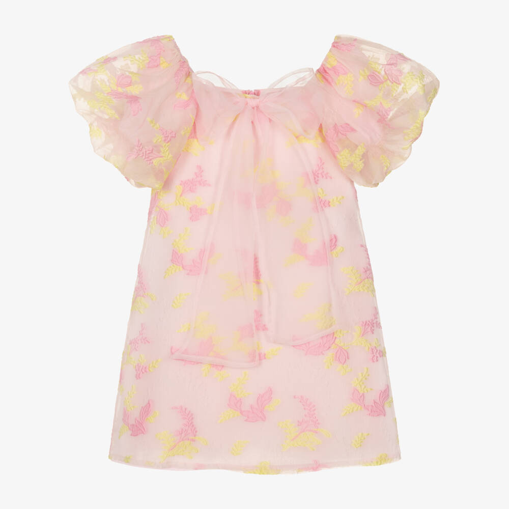 A gorgeous pink dress for girls by Mama Luma, handmade from textured organza. With a beautiful pink and yellow floral pattern, this lovely dress has a statement bow on the neckline and voluminous elasticated puff sleeves. It has a lightweight pink lining and fastens neatly on the back with a concealed zip.