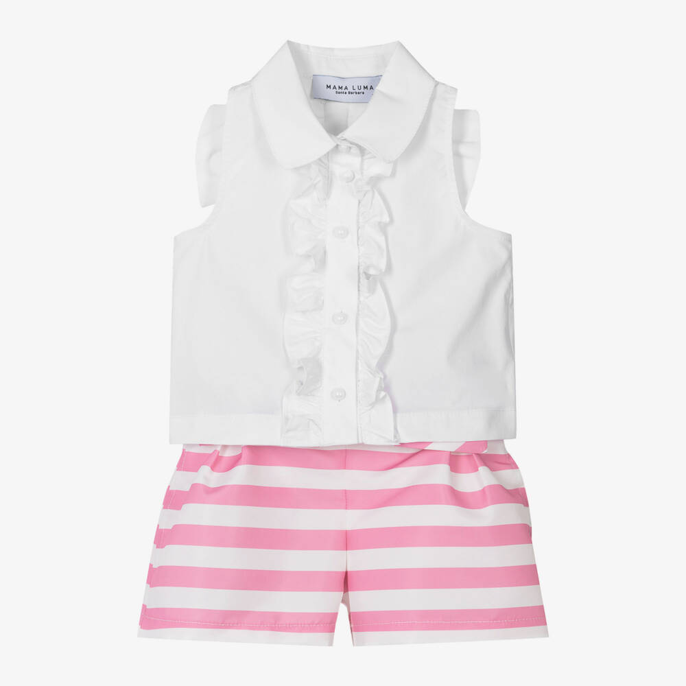 Pretty pink and white shorts set for girls by Mama Luma. This smart, handmade outfit has a white, sleeveless blouse with a ruffle trim on the front and back and a large bow on the stylish cut away back. Soft and lightweight with a slight stretch, it fastens with pretty pearl effect buttons on the front. The pink and white candy-striped shorts are made in soft satin twill with a side zip fastening. They have pleats on the front, concealed side seam pockets and a removable tie belt. Fully lined for comfort, they have a useful adjustable waist.