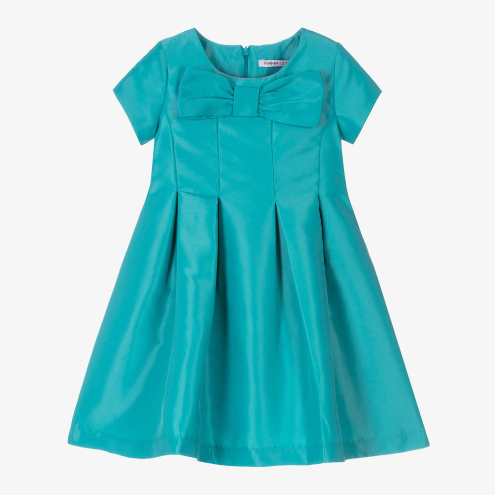 Beautiful turquoise blue special occasion dress for girls by Mama Luma, handmade in luxurious satin. This stylish dress has capped sleeves, a large fixed bow on the front and a full box-pleated skirt. Fully lined for comfort in a contrast pink lightweight voile, it fastens neatly around the back with a concealed zip.