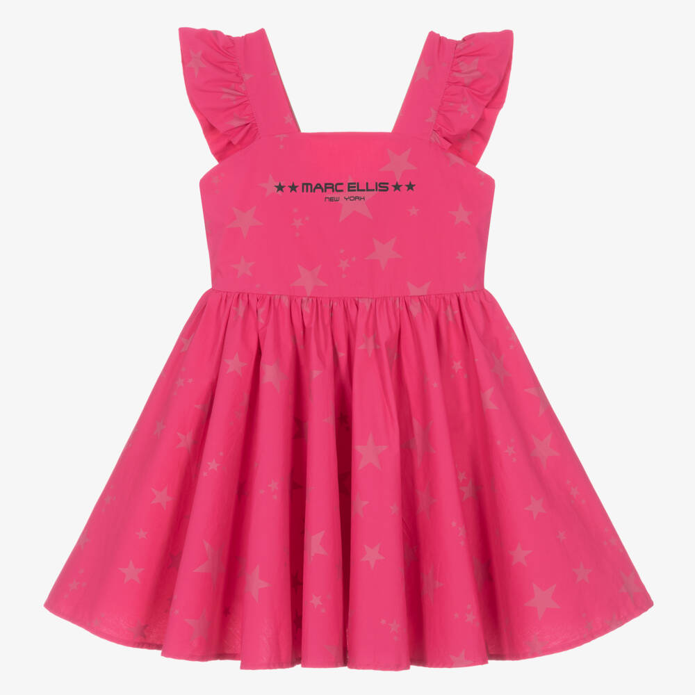 Pink cotton poplin dress for girls from Marc Ellis, with a fun star print and the designer's black logo on the bodice. Gathered on the waist, it has a classic, feminine silhouette and girly ruffles across the shoulder straps. This easy-to-fasten dress has a comfortable cotton voile lining and a concealed zip on the back.