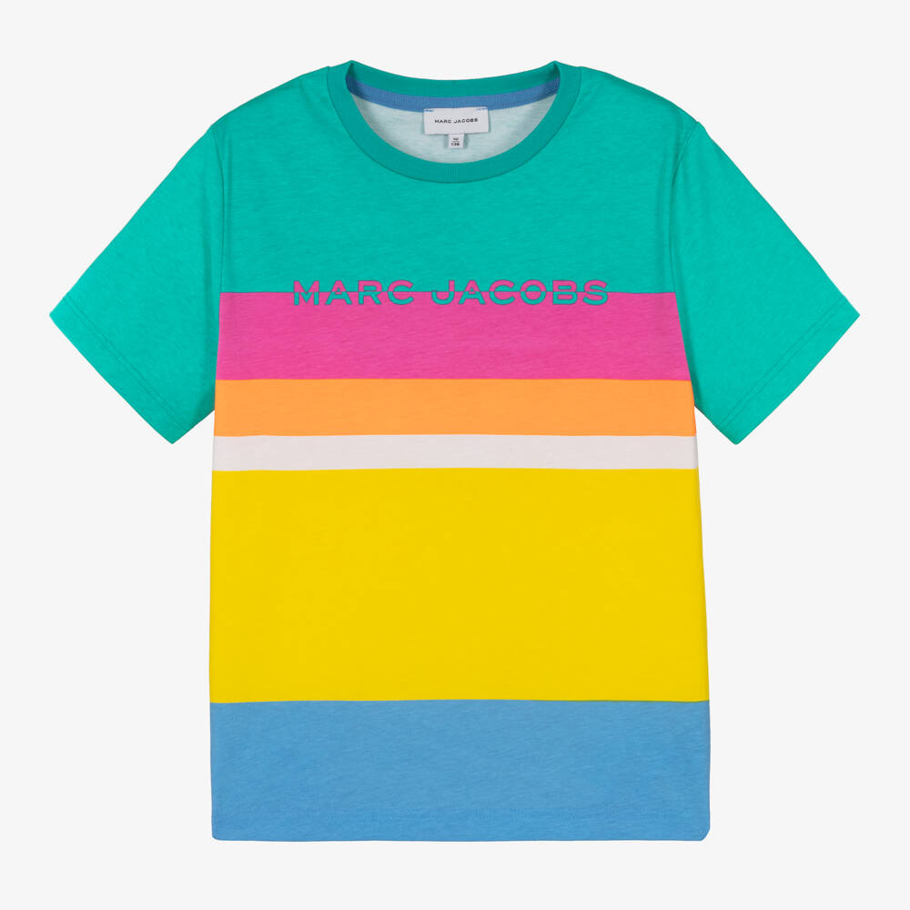 A bold and vibrant green T-shirt for teen boys by American brand Marc Jacobs, with the designer's recognisable logo across the front. Made from soft cotton jersey, this iconic tee is striped in pink, neon orange, yellow and blue. This product contains cotton from organic farming.