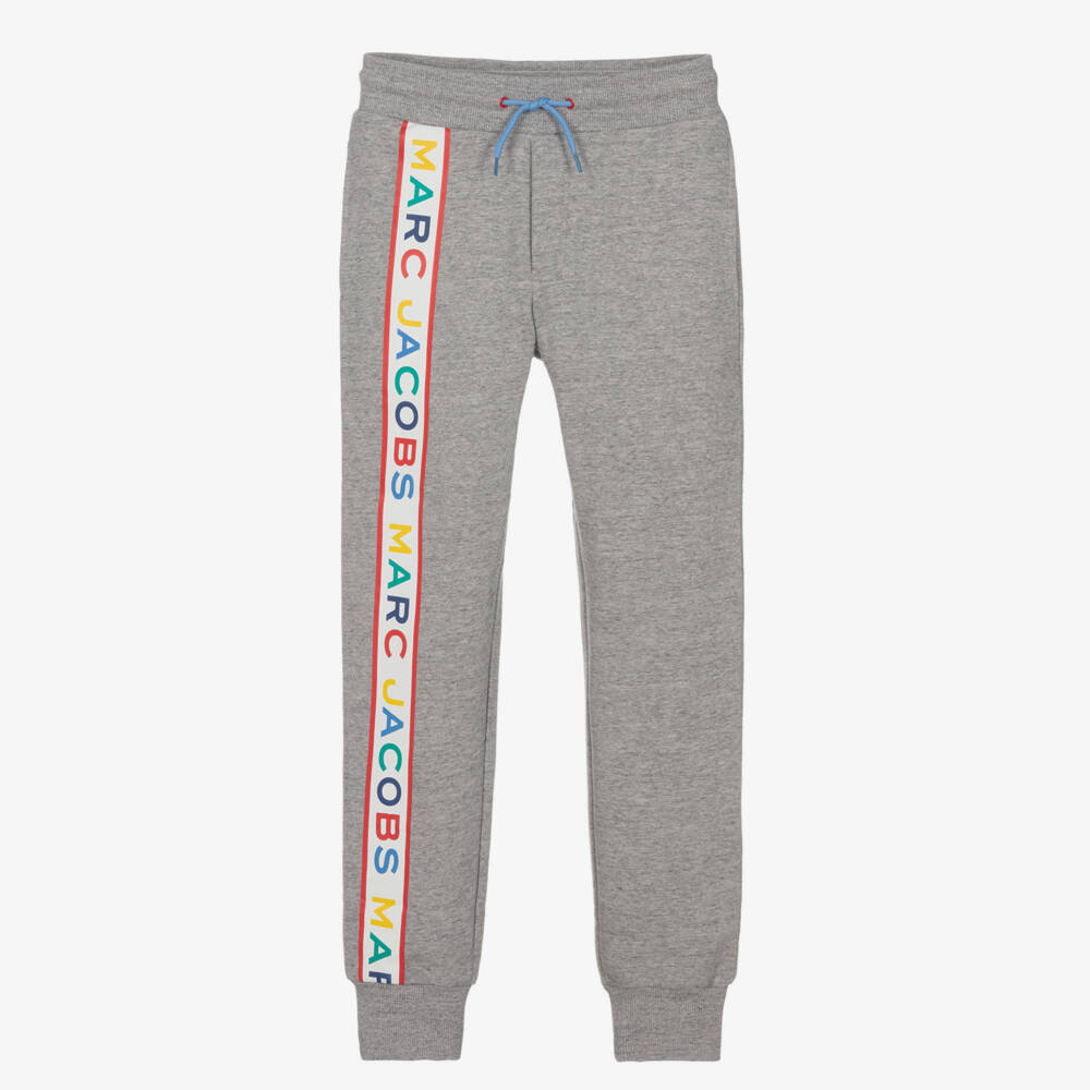Grey marl joggers for teen boys by American brand MARC JACOBS, made in organic cotton sweatshirt jersey. For unmistakable style, these essential bottoms have a colourful logo bad printed on the front and back of one leg. The elasticated waist has blue drawstring ties which can be adjusted easily for an optional fit. As well as pockets on the front and back, they have cosy ribbed trims for casual comfort.