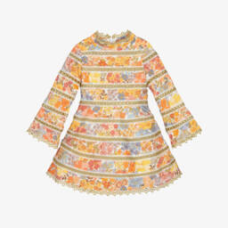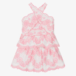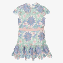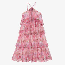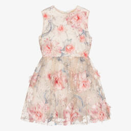 Gorgeous silver party or special occasion tulle dress for girls by Marlo Kids, shimmering with sequins. It has a neat, mandarin collar, cute, capped sleeves and a detachable satin floral appliqué sparkling with diamanté on the bodice. A tiered skirt adds to the look, whilst an exposed zip fastens on the back and a voile lining provides extra comfort.