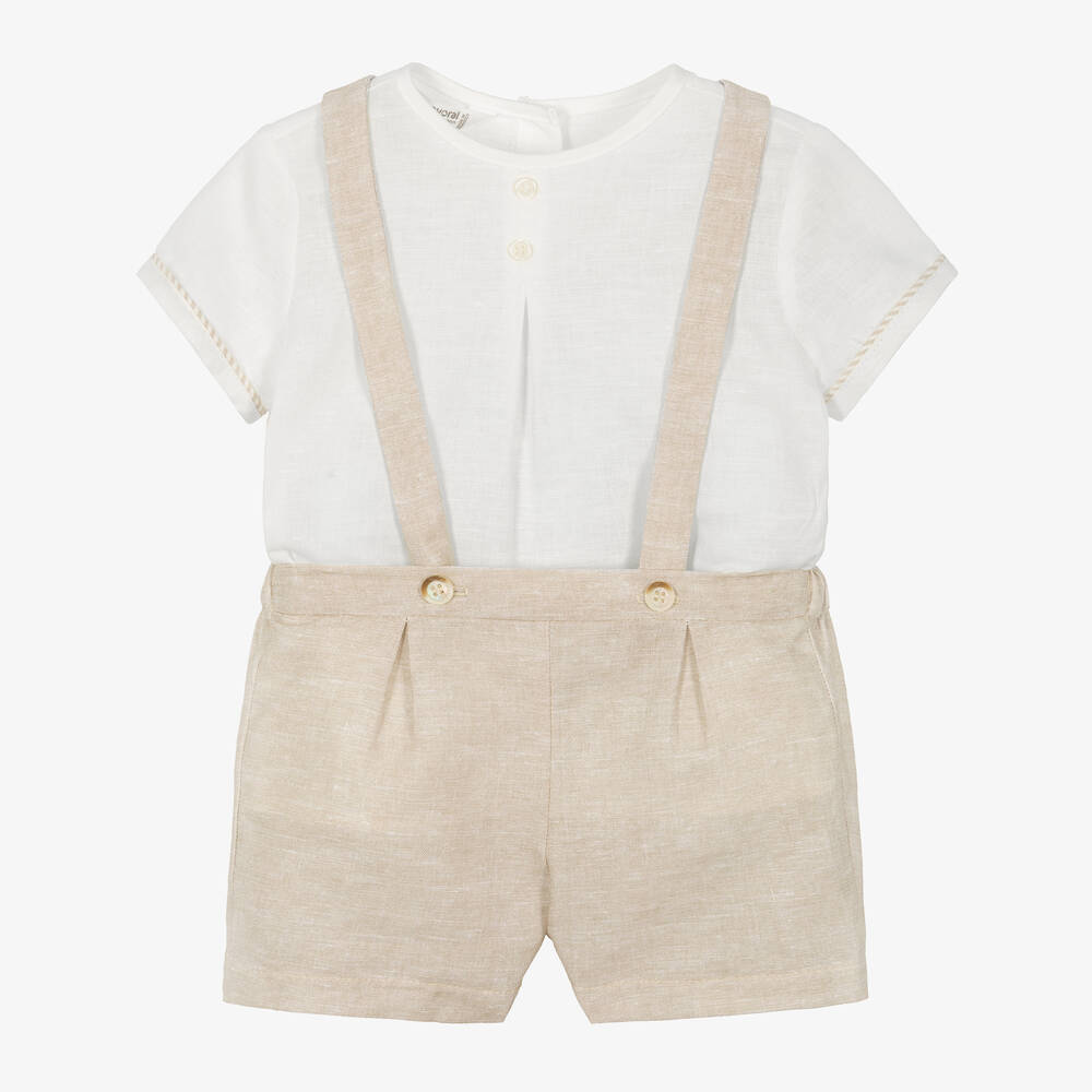 Beige and off-white shorts set for baby boys by Mayoral, woven from a lightweight linen and cotton blend. Ideal for the warmer weather, the short-sleeved shirt has a vertical striped pattern and a comfortable round neckline. There are decorative buttons on the front, as well as functional button fastenings on the back. Completing the outfit, the shorts are elasticated on the back of the waist and have detachable shoulder straps for different styling options.