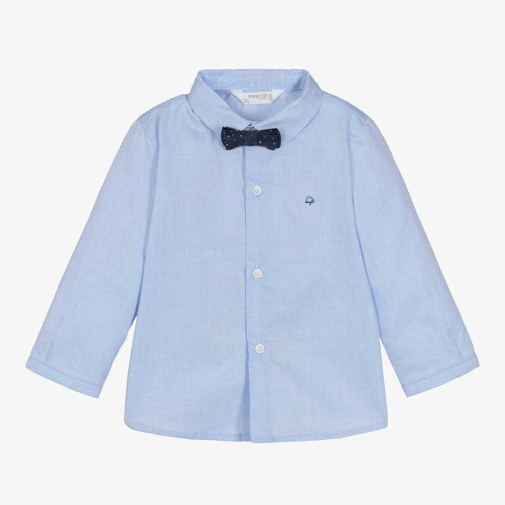 Light blue shirt for baby boys by Mayoral, woven in lightweight sustainable cotton. Decorated with a rubber logo on the chest, it has a cute, detachable bow tie secured with velcro for easy dressing. Fastening with buttons on the front and on the cuffs, it has a pointed collar to finish this smart style.