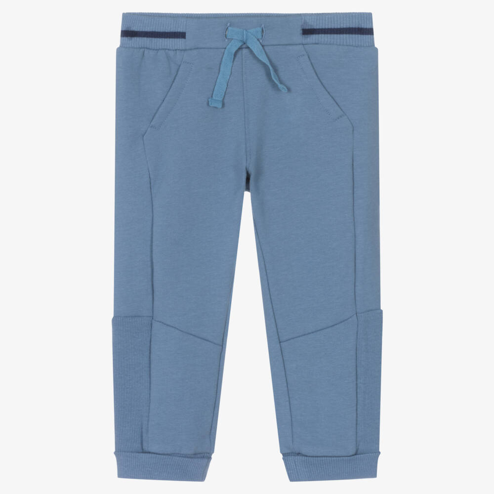 Dusky blue joggers for baby boys by Mayoral, made in soft and stretchy cotton jersey. Ideal for casual days, these comfortable trousers have a soft fleecy inside and ribbed cuffs that can be turned up or down. The stretchy, ribbed waistband has a faux drawstring on the front and a dark blue stripe around the middle. The small pocket on the back is printed with a small logo.