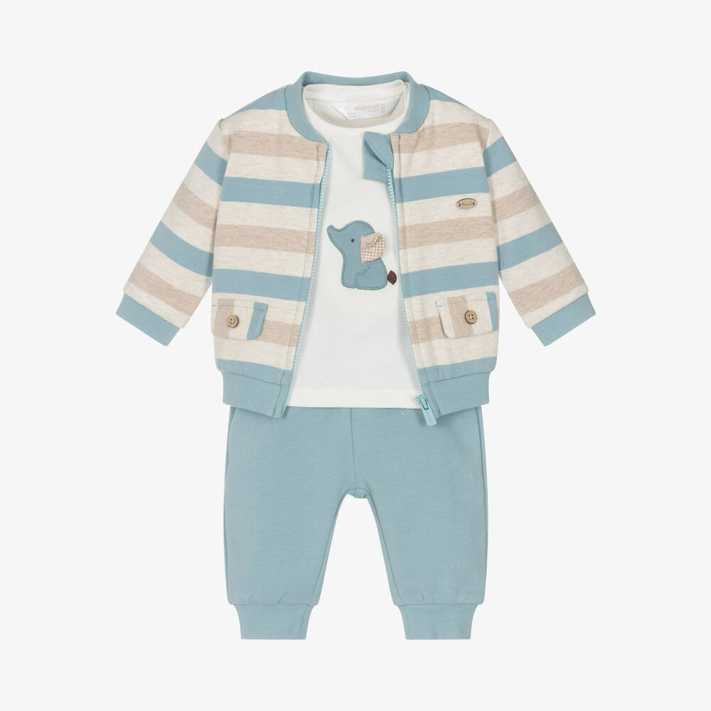 Casual and comfortable for baby boys, this cute tracksuit set is by Mayoral. In blue, ivory and beige stripes, the zip-up top has sweet faux pockets on the front and a protective chin guard over the zip puller. The blue joggers have cuffed ankles and a comfortable elasticated waist. Completing the set is an ivory long-sleeved top, with a sweet elephant appliqué on the front, and easy-fastening poppers on one shoulder.