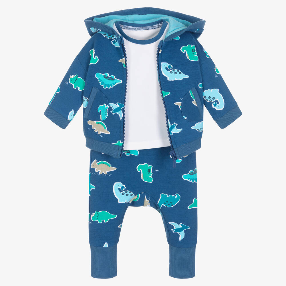 Dark blue tracksuit and T-shirt set for baby boys from Mayoral, made in soft and stretchy sustainable cotton jersey. The white colourblock T-shirt has a cute dinosaur shaped front pocket, green and blue trims, and shoulder poppers for easy dressing. The zip-up top has adorable little dinosaur graphics, ribbed trims and a sky blue hood lining. The matching dino-printed joggers have an elasticated waist with a faux drawstring for quick changing.