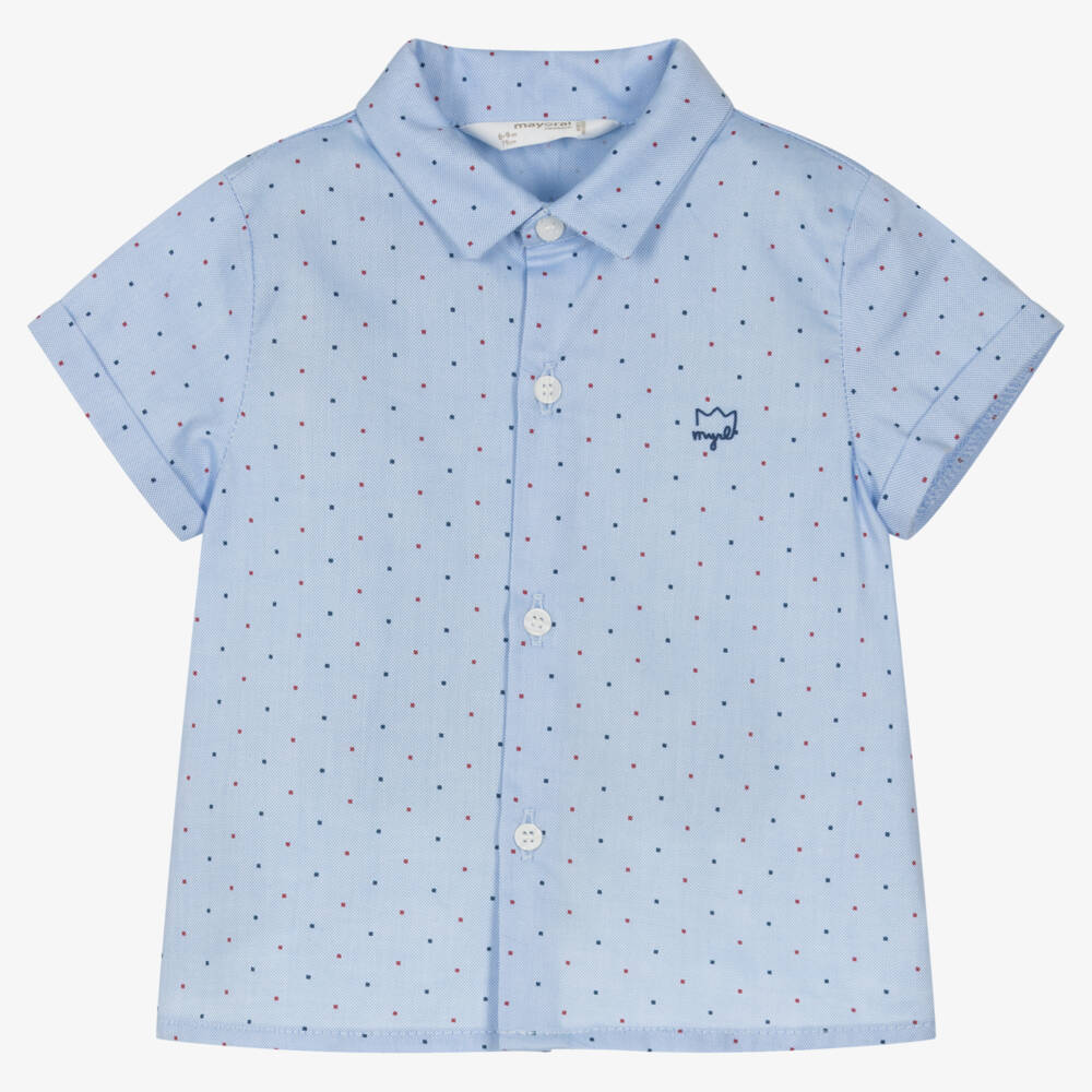 Blue short-sleeved shirt for baby boys, by Mayoral. Woven in soft organic cotton, it has a red and blue dotted pattern all-over and a rubberised logo on the chest. Fastening with useful buttons on the front, it has a crisp, pointed collar for a smart finish.
