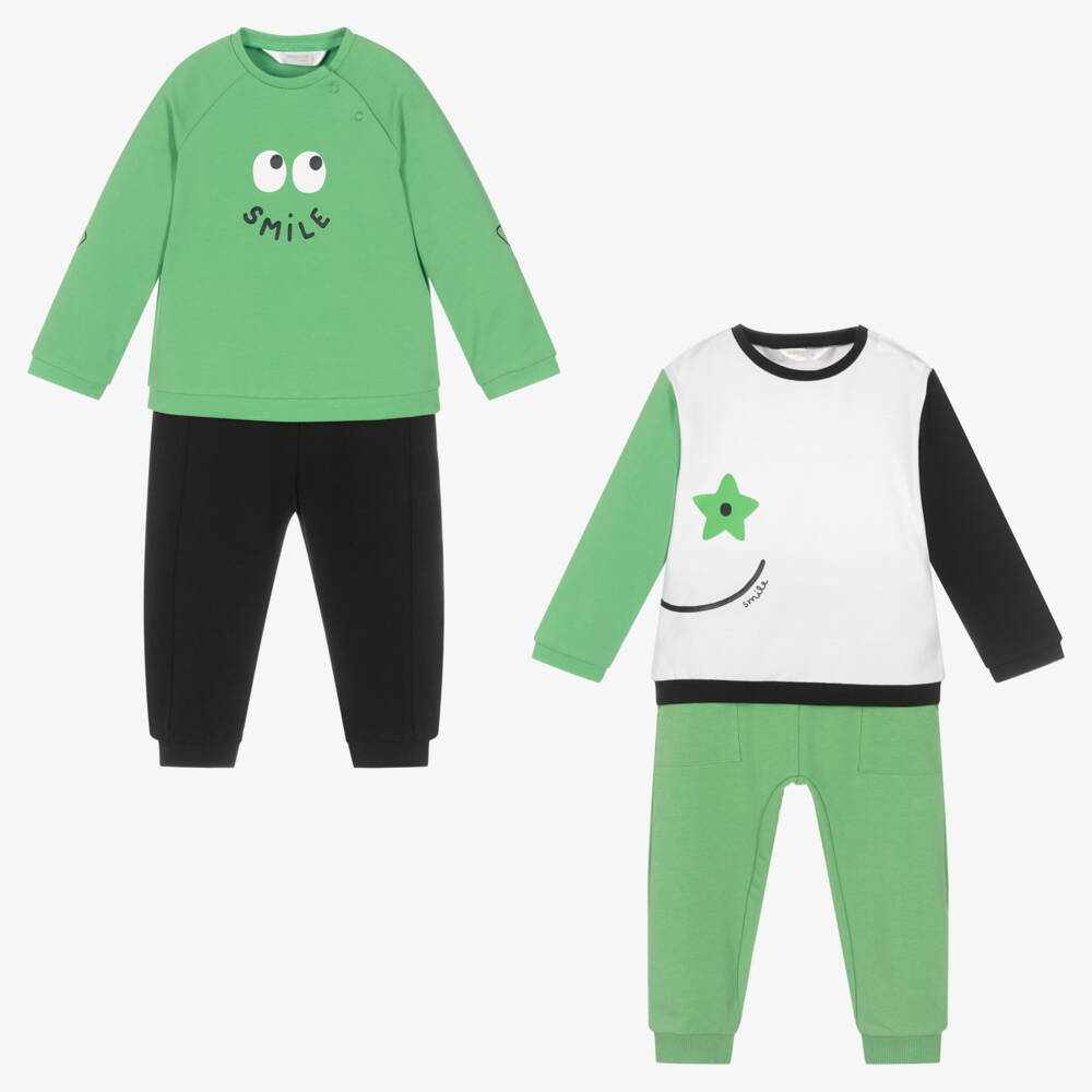 A pack of two green and white trouser sets for baby boys from Mayoral, made in stretchy cotton jersey. The white, green and black colourblock top is stamped with a cute 'smile' and star print on the front, and the green top has a sweet happy face graphic and raglan sleeves with stars on the elbows. The jogger-style trousers have softly elasticated waists, gentle on little tummies. In co-ordinating colours, these casual sets are interchangeable to switch up his look.