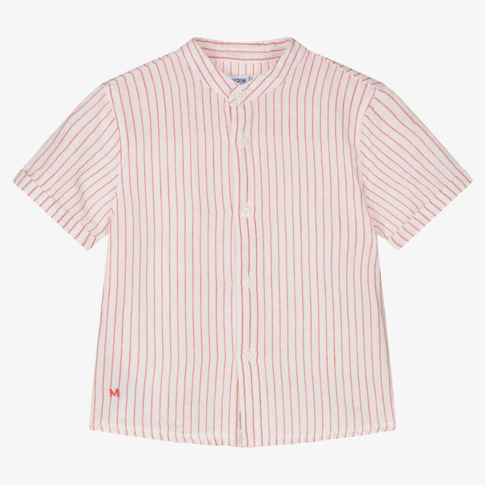 Ivory and red stripe shirt for baby boys by Spanish brand Mayoral, made in soft and airy linen blend. It has a mandarin collar, turn-up sleeves and a red embroidered logo for a cool, casual style. There are button fastenings on the front.