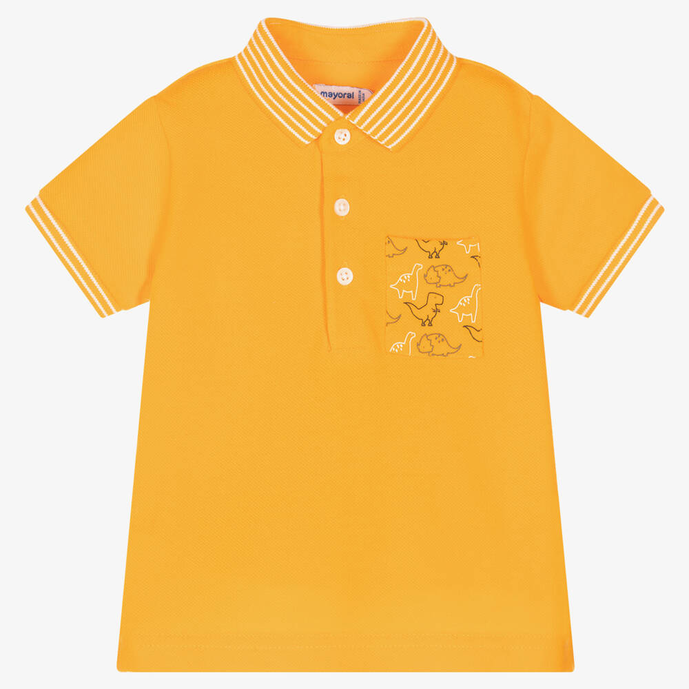 Easy-to-wear sunset orange polo shirt for baby boys by Spanish brand Mayoral, made in soft and comfortable sustainable cotton piqué. It has striped trims, button fastenings and a front pocket with a dinosaur print.